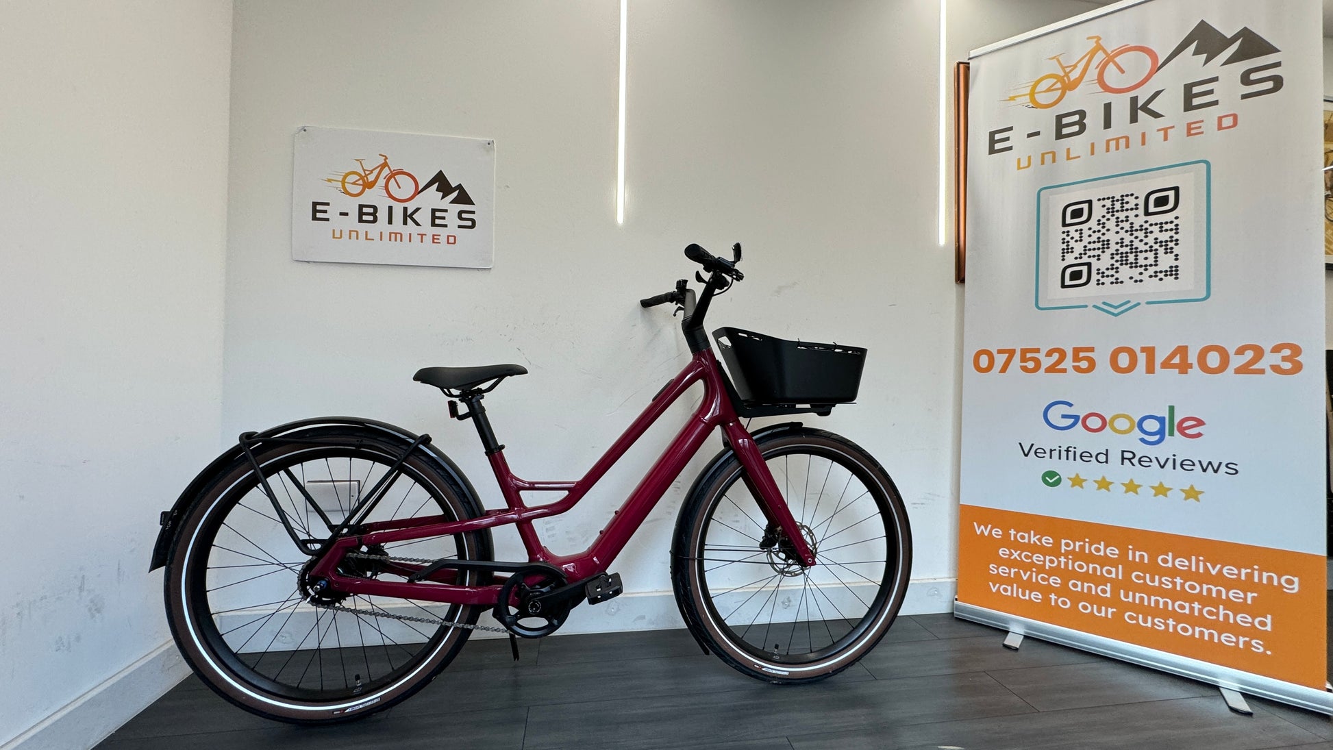 - Frame: E5 Premium Aluminium – step-through frame with internal cable routing