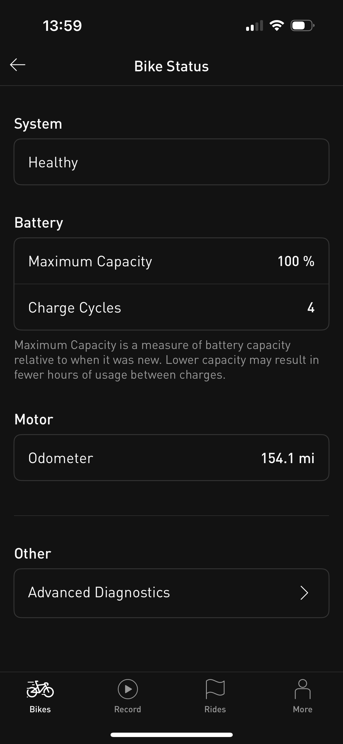 The bike comes with both original keys, the charger, and the original book pack. It has only been charged four times, and the system shows a healthy status, making it ready for its next owner to enjoy immediately.